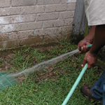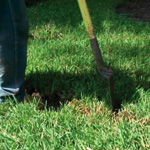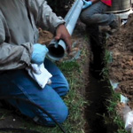 Our crew begins by marking the ground for placement of the Olshan Drainage System pipe. Grass is carefully removed and saved prior to digging the trench.