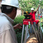 The trench is dug and cleaned to accommodate the Olshan Drainage System pipe. Next, the trench is carefully graded and leveled to ensure proper water flow. Often, surveying equipment is used to determine the proper height, slope and fall of the trench.