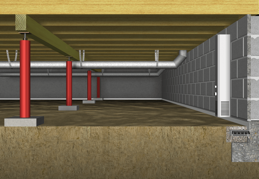 A complete crawl space recovery with Olshan’s CrawlSafe™ System begins with identification and repair of failing supports using SafeAdjust® Adjustable Support Columns.